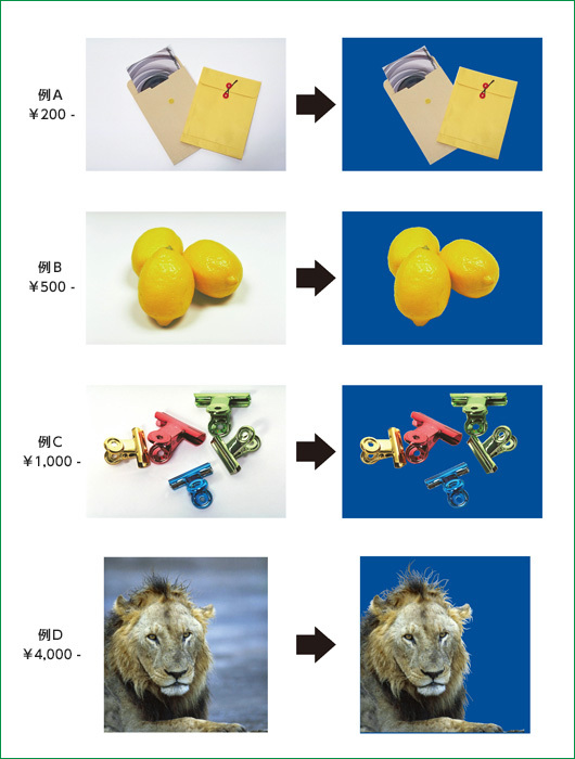 | 難易度B | @500〜/1点 | 最短1時間納品 | 切り抜きを自動システムで行い、オペレーターが最終確認と補正を行います。(自動で出来ない場合もございます。詳しくはスタッフまでお問い合わせください) |