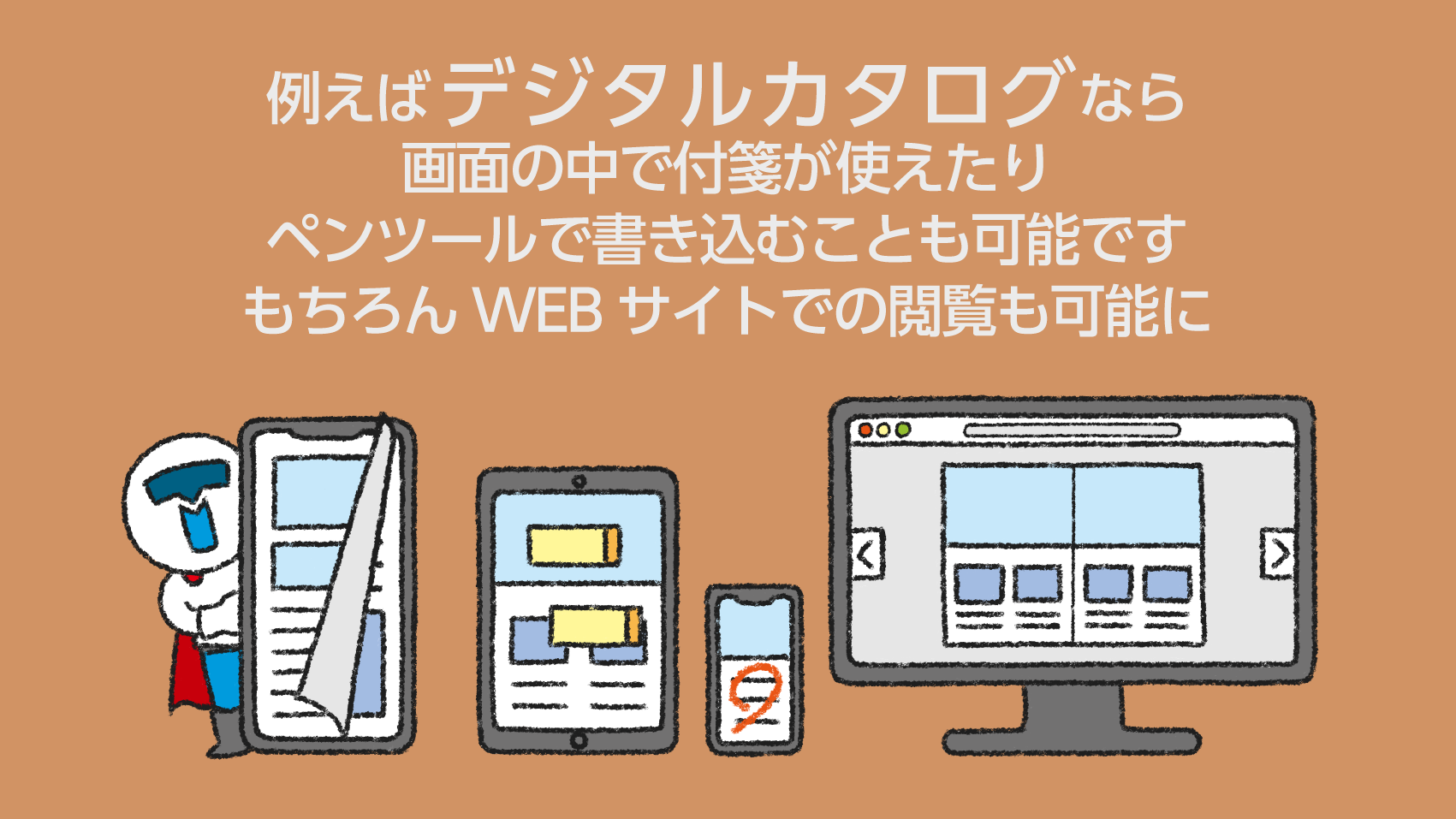 ● 例えばデジタルカタログなら、画面の中で付箋が使えたり、ペンツールで書き込むことも可能です。もちろんWEBサイトでの閲覧も可能に