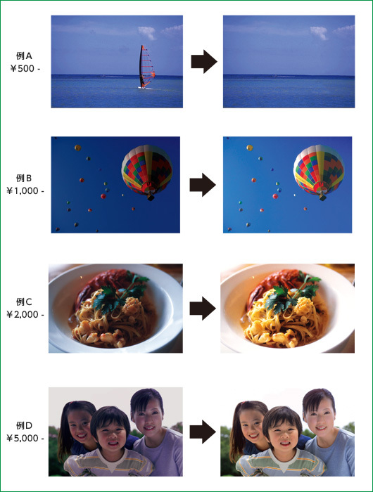 | 難易度C | @2,000〜/1点 | 最短2時間納品点 | 画像補正で電柱や電線を消す。オペレーターが最終確認と補正を行います |